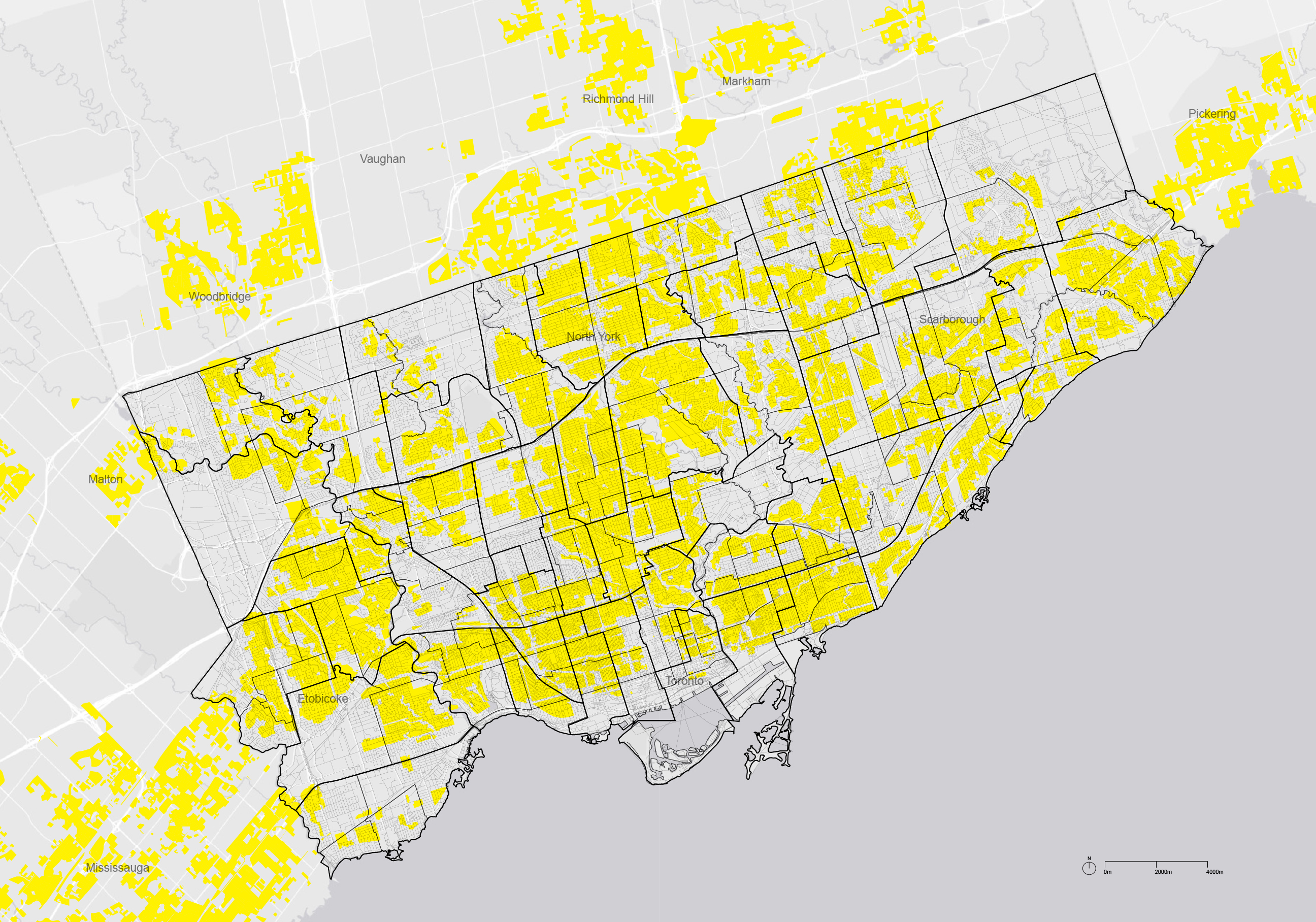 The City of Toronto is now undergoing a well-known housing crisis, as the price of housing soars and the city strives to build more expensive condominium development in its designated areas for growth such as the downtown core, the majority of regional land supply remains off limits. The vast areas of detached homes that cover most of the land provide its lowest densities for housing and are protected from change.