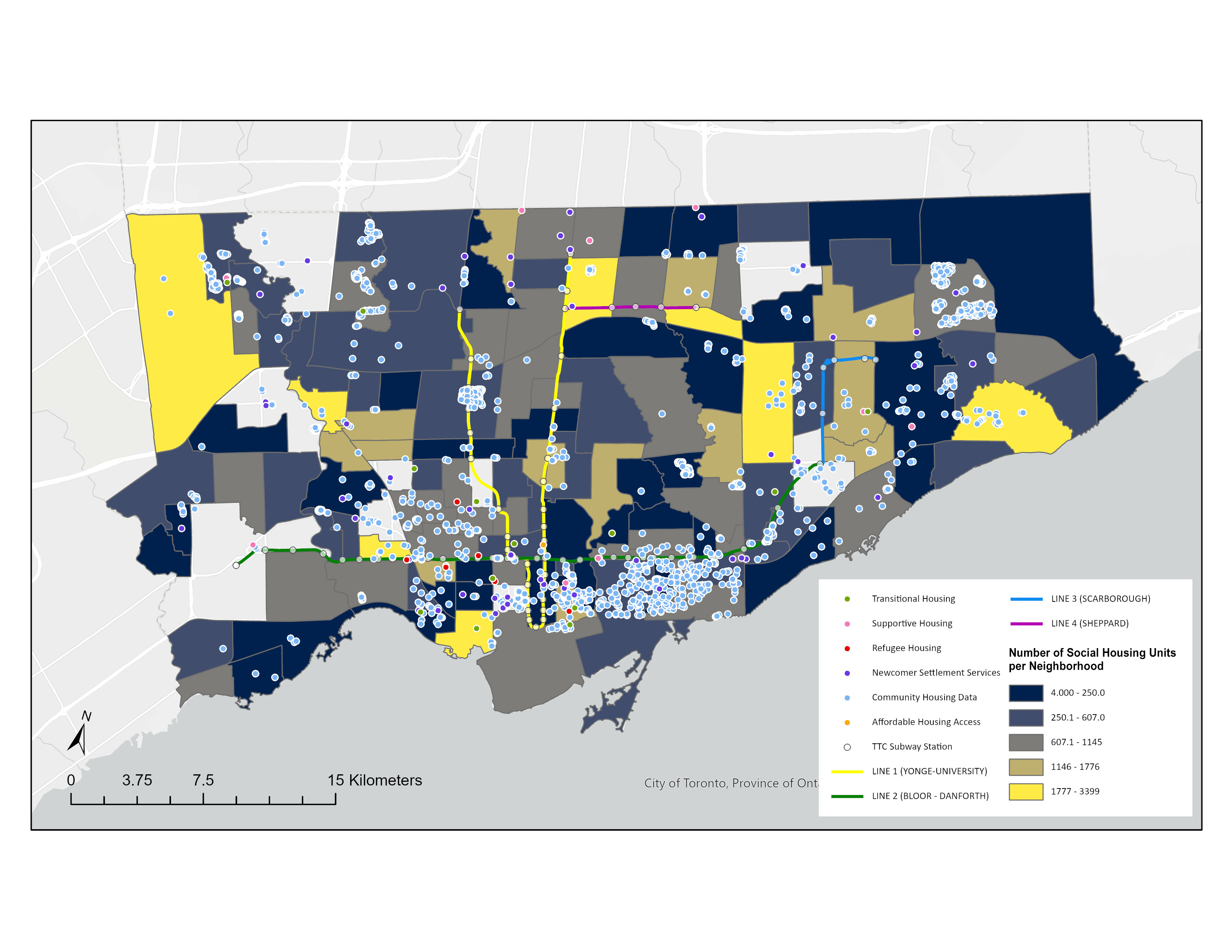 This map depicts the social housing service network in the City of Toronto and the number of social housing units per neighborhood. Through various programs and initiatives, such as subsidized housing, rent supplements, transitional housing, newcomer service and refugee housing, the city strives to address homelessness, housing insecurity, and affordability challenges targeting different groups of people. In the choropleth map, we can also see that certain neighborhoods with a higher concentration of social housing units also exhibit limited transit accessibility. This underscores the need for the development of transit-oriented and walkable alternative housing options, ensuring equitable access to transportation and fostering inclusive, livable communities across the city.