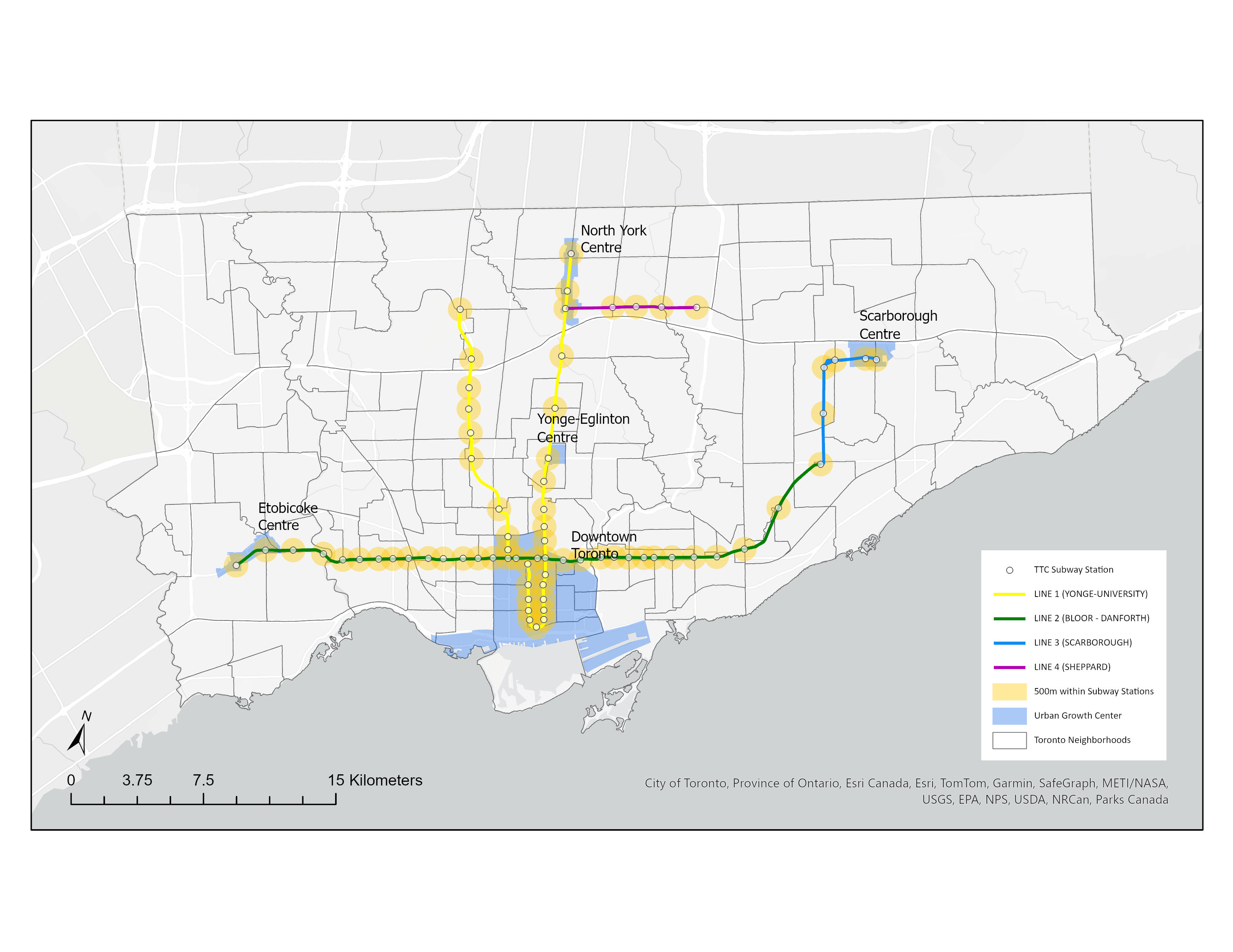 In 2010, the Growth Plan identified five Urban Growth Centres in Toronto: Downtown/Waterfront, Scarborough Centre, North York Centre, Etobicoke Centre and Yonge-Eglinton Centre. These Urban Growth Centres stand as pivotal hubs for sustainable urban growth and aim to achieve 400 people plus jobs per hectare by 2031. Strategically positioned around transit hubs, they also offer opportunities for development of middle-density and mid-rise residential and commercial properties, aiming to create vibrant, transit-oriented communities that cater to diverse housing needs while fostering a dynamic, livable cityscape.