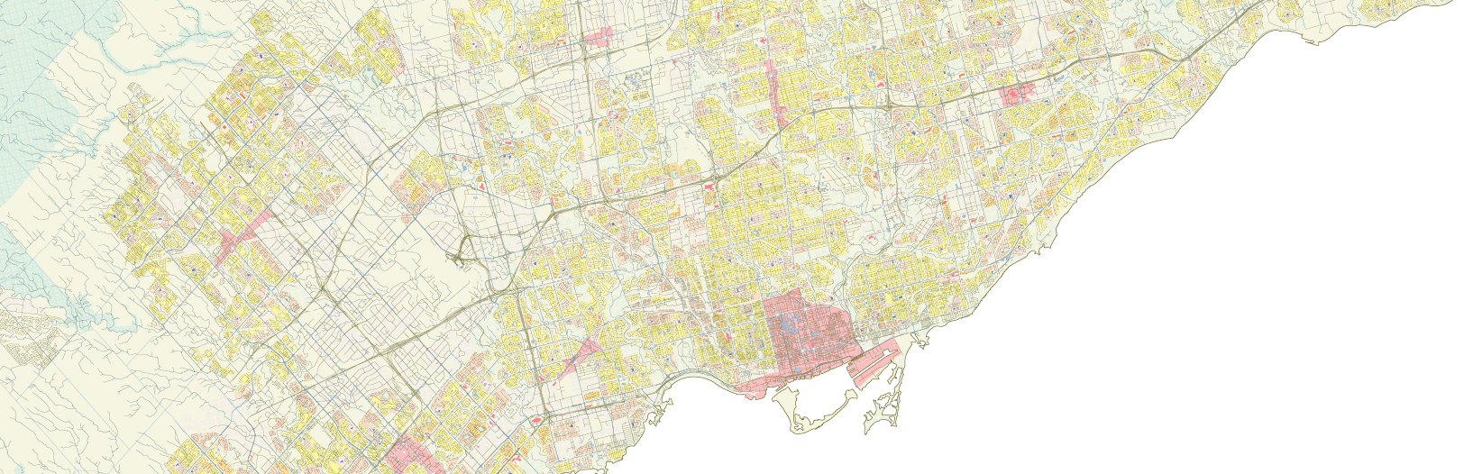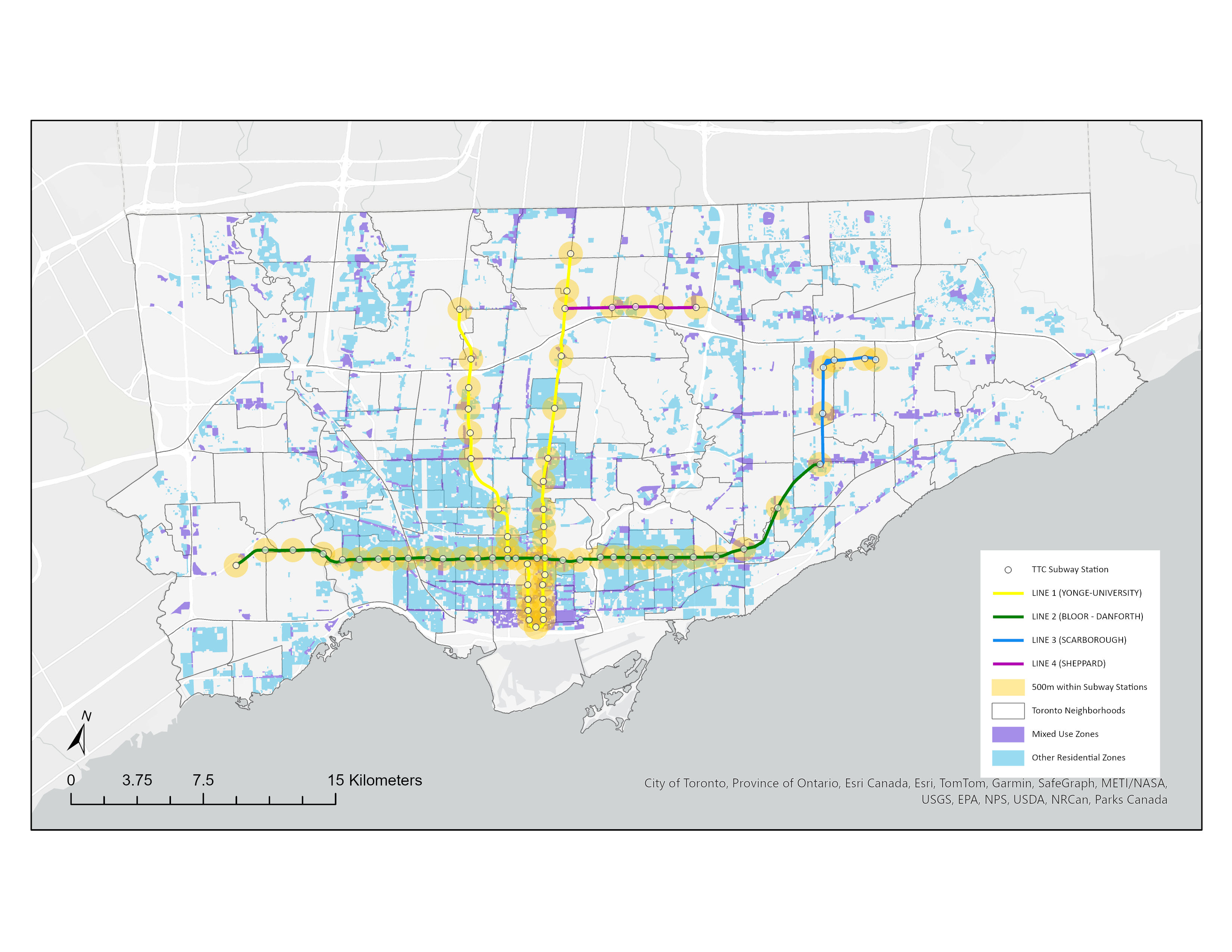 Within Toronto's residential zones, a significant portion—54.3%—is characterized by single detached dwellings, forming the recognizable yellowbelt areas. Beyond this, 39.9% of residential lands offer varied housing typologies such as apartments and townhouses, while 5.8% are designated as mixed-use zones blending commercial and residential purposes. To explore development opportunities further, 500-meter buffers around subway stations are used in the accompanying map to identify potential sites for mixed-use and mid-rise residential zones. These zones, designed for middle-density living, aim to diversify the housing landscape, complementing the existing single detached zones within Toronto's yellowbelt.